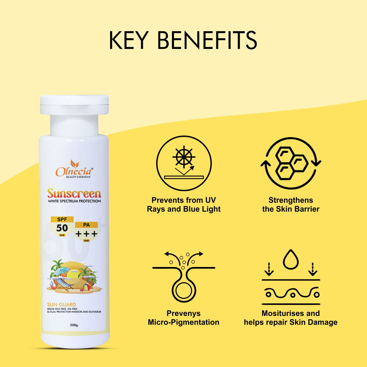 Olnecia Sunscreen is specially formulated to protect your skin from harmful UVA and UVB rays. Its lightweight, non-greasy formula provides broad-spectrum protection while keeping your skin soft, smooth, and hydrated. With regular use, it helps prevent sunburn, tanning, and premature aging, ensuring your skin stays healthy and glowing.